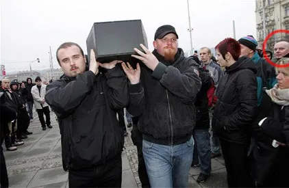 Naše vzpomínka ale nebyla v tento den jediná. Shromáždění na Palackého náměstí svolala také organizace Autonomní nacionalisté střední Čechy, o jejíž skutečné politické inklinaci a i volnočasových aktivitách jejích členů zde a zde jsme již informovali. Demo mělo být symbolickým pohřbem svobody slova a demokracie, kterých se neonacisté tak rádi dovolávají, přestože sami demokracii nenávidí.