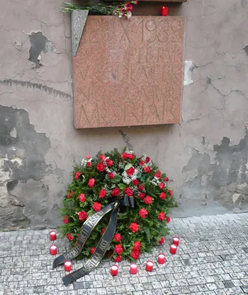Věnec před památníkem Jana Opletala a Václava Sedláčka v Žitné ulici
