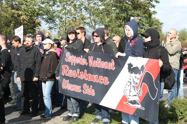 František Červenka v Kladně stojí po boku děvčat z neonacistické ženské organizace Women side a jejich transparentu s trikolorou Třetí říše.