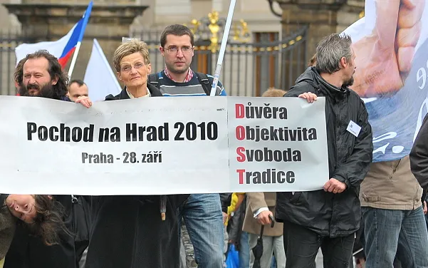 František Červenka se při druhém pochodu iniciativy D.O.S.T. na hrad ohlíží směrem k sídlu hlavy státu, za ním aktivista NO/BaH Petr Fryč