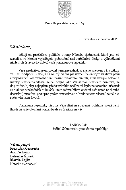 I když František Červenka v této době hovořil o mezinárodním spiknutí a zednářských lóžích a účastnil se demonstrací spolu s neonacisty, uvědomoval si, že v reálné politice nemá tento postoj význam. Proto se NSJ v červnu 2005 postavilo verbálně na obranu prezidenta Klause a jeho euroskeptických názorů. Zajímavý moment nastal, když na dopis, který NSJ prezidentovi zaslal, odpověděl jeho tajemník Ladislav Jakl s přátelským poděkováním. Tento krok prezidentské kanceláře vyvolal již tehdy poměrně značné pobouření a reagovala na něj řada médií.