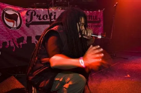 Aki: Určitě, ale právě my tu alternativu musíme ukázat. Lidé musí pochopit, že je jedno, jestli jsi muslim, křesťan, žid, ateista, anarchista nebo demokrat. V jádru jsme všichni stejní, nikdo není lepší nebo horší, to jenom ti nahoře se nás snaží rozdělit a postavit proti sobě. Neonacisté jsou stále silnější, taky proto, že si s nimi nikdo nechce špinit ruce. Moje názory jsou docela známé. BBC mne nedávno vyzvala, abych se zúčastnil televizní debaty s Nickem Griffinem, vůdcem BNP. A já do té debaty půjdu, i když polovina mého já se proti tomu bouří a říká: není to tvůj oponent, se kterým by sis pokecal u čaje, je to nepřítel. Dodám mu legitimitu, když s ním budu mluvit? Určitě, ale zároveň doufám, že ho znemožním a ukážu, jak se mýlí. Nedávno jsem viděl Griffina v televizi, všichni odmítli se s ním setkat a tak tam seděl jenom s takovým přitroublým moderátorem. V jednu chvíli Griffin řekl: “Až vyhrajeme, všichni budou muset dělat, co my řekneme!“ V tu chvíli jsem zajásal – teď se chytil do vlastní pasti, to je jeho konec! A ten moderátor na to: “Ano, jistě, jistě.“ A publikum ve studiu jenom kývalo hlavami! Nemohl jsem tomu uvěřit! Takže půjdu. Už jsem několik takových debat absolvoval a vždycky jsem zvítězil. Fašisté mají spoustu chytrých argumentů a mají pravdu v mnoha věcech, co se týká kritiky systému. Problém je v řešeních, která nabízejí. My jako kapela nemůžeme udělat moc, abychom je zastavili, ale děláme, co můžeme a jenom doufáme, že se ostatní přidají. A je pro nás obrovskou vzpruhou vidět, že všude na světě jsou lidé, kteří proti fašistům jdou. Viděli jsme záběry z blokády v Praze u nás v televizi, bylo to skvělý, tyhle věci mají obrovský význam pro všechny antifašisty, ať jsou kdekoliv. Úplně jsem cítil ten adrenalin!