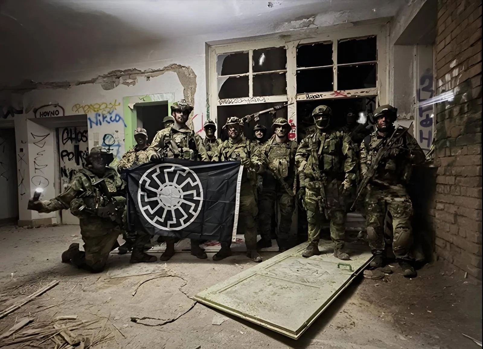 Skupinová fotka Brigády s velkou vlajkou se symbolem Schwarze Sonne, kterou drží Vítězslav Baránek