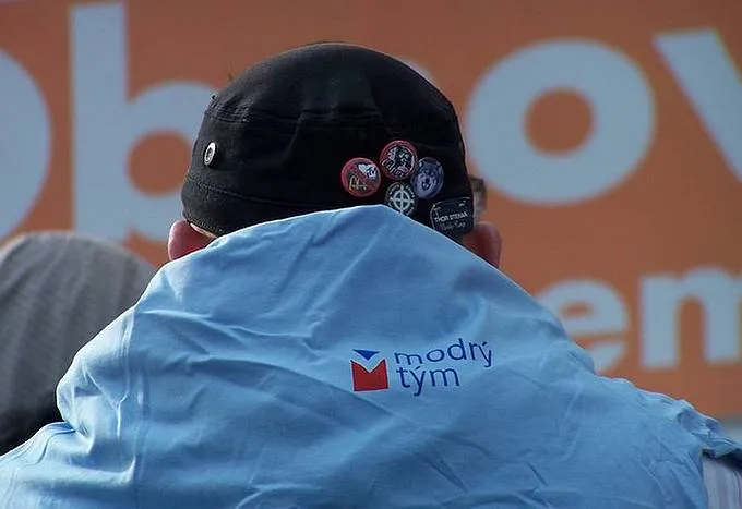 Člen Modrého týmu ODS ozdobený plackami Odpor, keltským křížem a Thor Steinar: