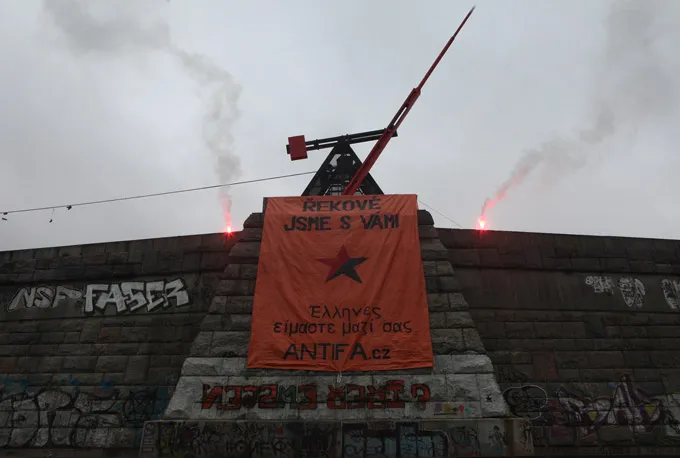 Na výraz podpory řeckým protestům byl dnes vyvěšen velkoplošný transparent na pražské Letné v prostoru bývalého Stalinova pomníku.