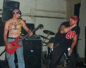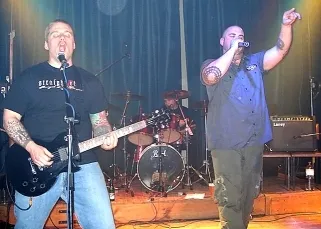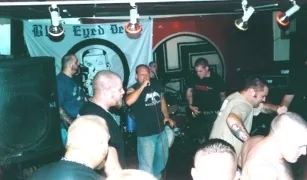 Blue Eyed Devils na koncertě, Robert Huber zcela vpravo před vlajkou s hákovým křížem