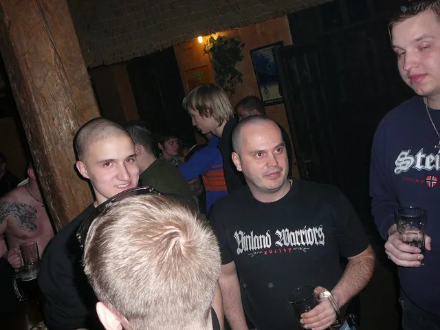 Zasněný Jiří Petřivalský (zcela vpravo v mikině Thor Steinar) během narozeninové oslavy